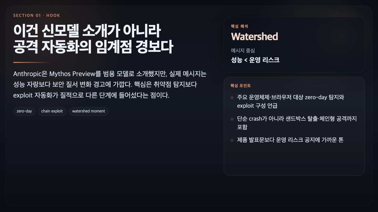 이 글은 Anthropic의 공개 포스트 Assessing Claude Mythos Preview's cybersecurity capabilities를 바탕으로, 왜 Mythos Preview가 "공개하기엔 너무 위험한 AI"로 읽히는지 정리한 것이다. 각 소주제 이미지는 웹 본문에 자연스럽게 붙도록 Remotion으로 별도 렌더링한 와이드 정리 카드다.