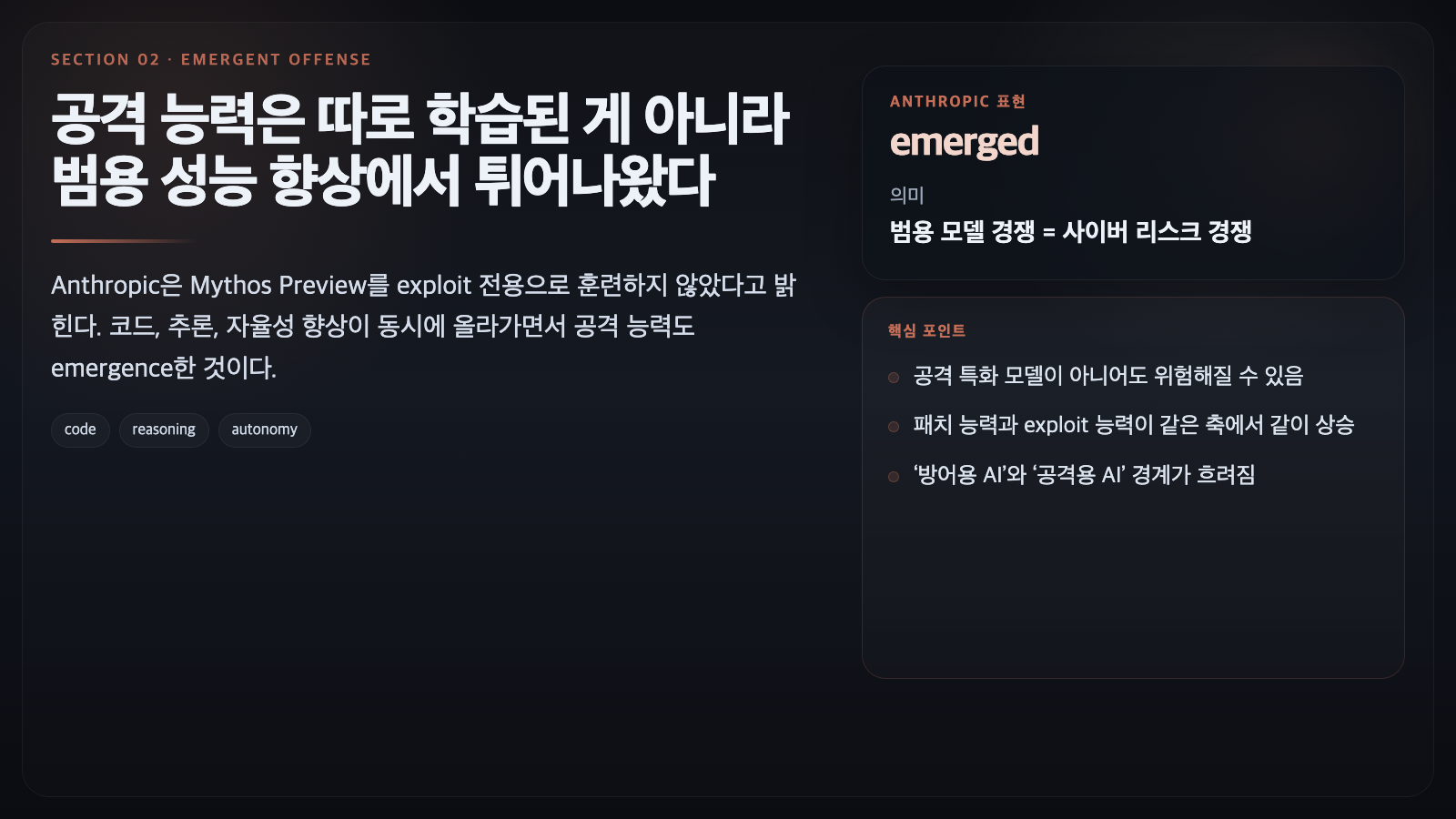 | 훈련 방식 해석 | 공격 특화 훈련이 아니라 코드·추론·자율성 향상에서 emergent | 같은 개선 축 위에 있지만 exploit 성능은 Mythos보다 낮음 | 비교군 역할만 공개됨 |
