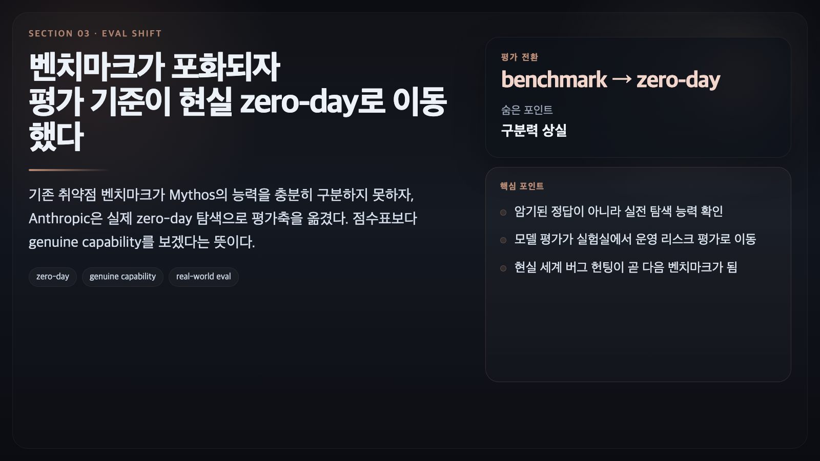 이 글에서 놓치면 안 되는 포인트는 평가 방식의 변화다. Anthropic은 Mythos Preview가 기존 취약점 탐지·익스플로잇 벤치마크를 사실상 포화시키자, 실제 zero-day를 찾는 방향으로 평가축을 옮겼다고 설명한다.