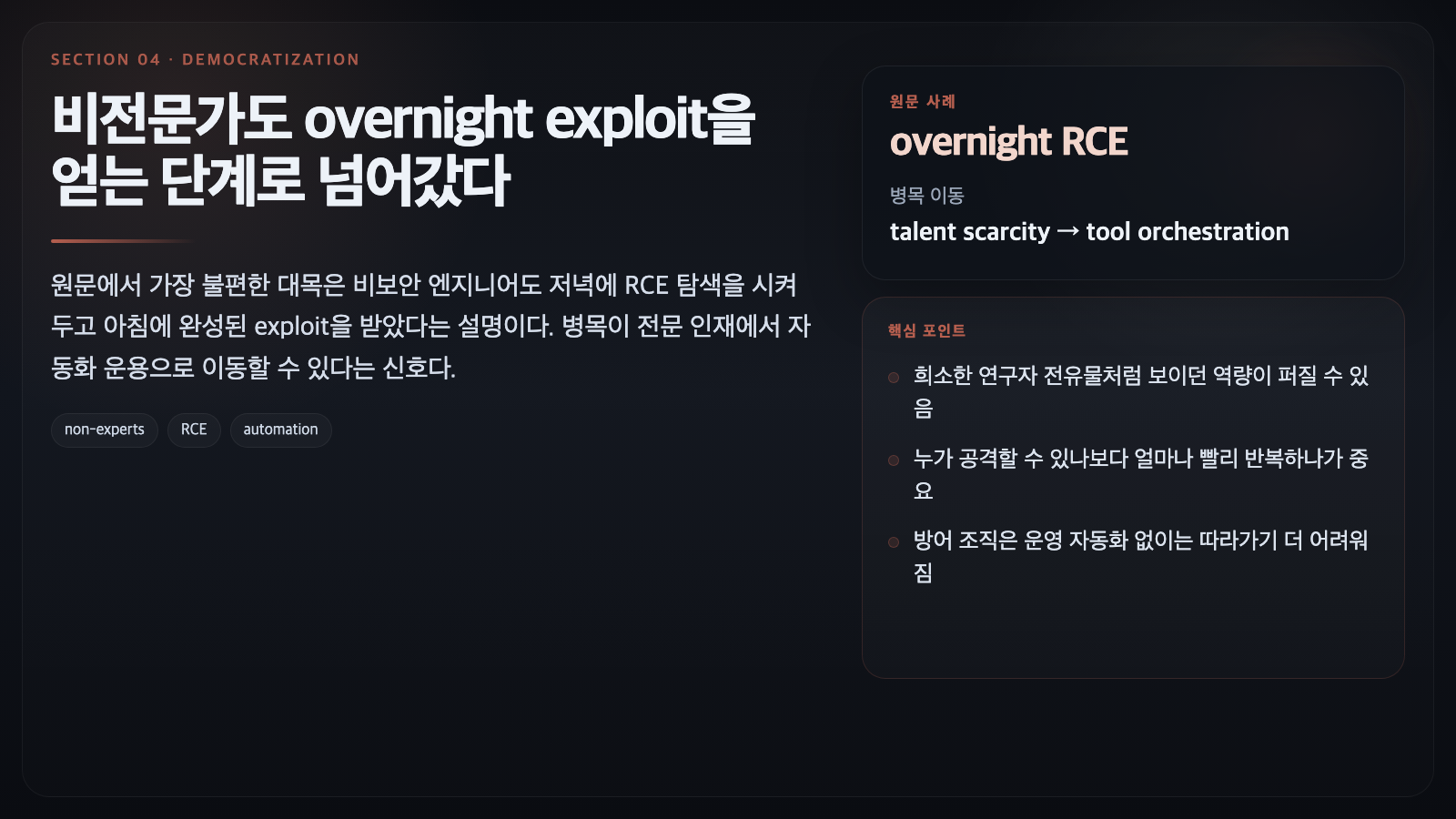 - 희소한 전문가의 생산성이 높아지는 수준이 아니라, 공격 능력의 분산이 시작될 수 있다.
