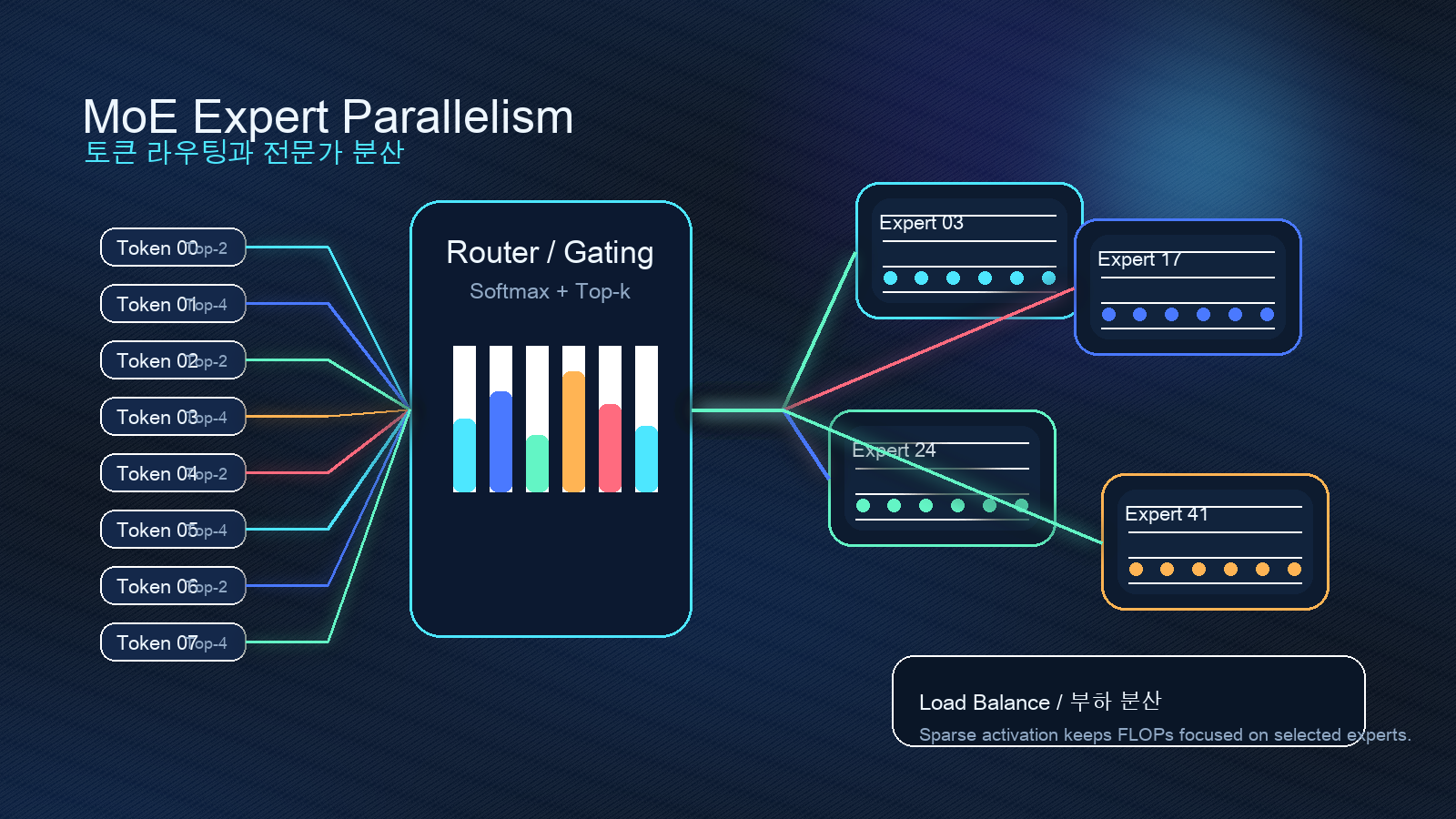 하지만 sparse activation은 공짜가 아니다. 토큰을 어떤 expert로 보낼지 결정하고, GPU와 노드 사이로 데이터를 흩뿌린 뒤, 다시 결과를 모아야 한다. 이 dispatch/combine 구간이 느리면 MoE의 이론적 효율은 서비스 지연시간에서 사라진다.