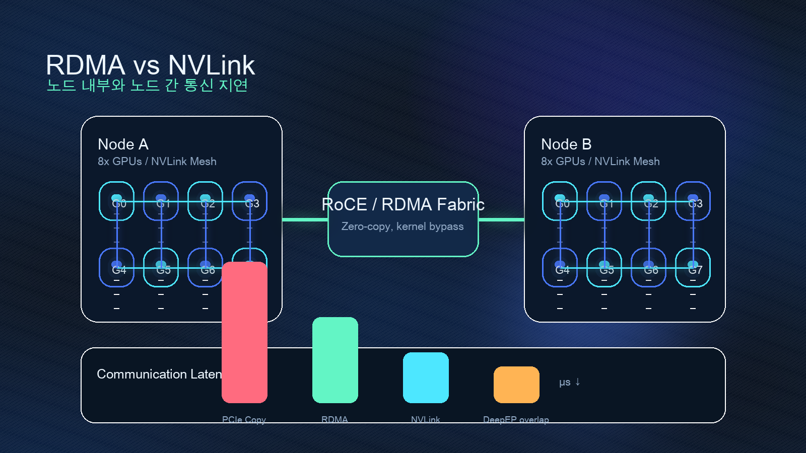 같은 모델이라도 NVLink가 있는지, RDMA가 안정적인지, expert를 어떻게 shard했는지에 따라 체감 성능이 바뀐다. 따라서 GPU 서버 견적을 낼 때도 "몇 장짜리 GPU인가"보다 노드 내부/노드 간 연결이 어떤 MoE traffic을 버틸 수 있는가를 물어야 한다.