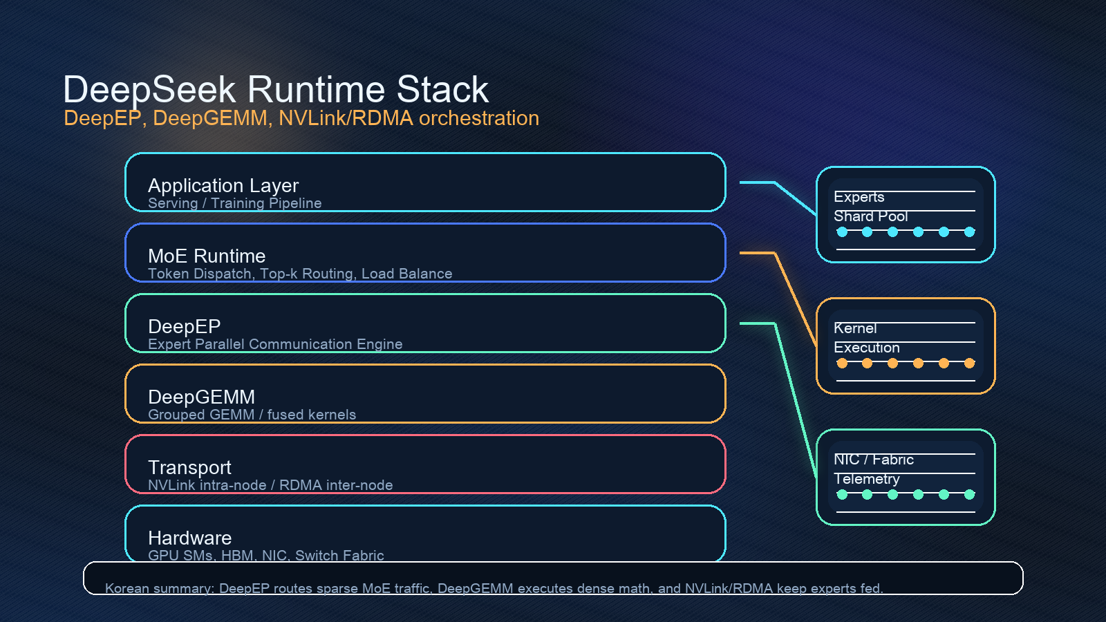 DeepSeek의 DeepEP를 그냥 "또 하나의 CUDA 라이브러리"로 보면 핵심을 놓친다. 지금 중요한 변화는 모델 아키텍처가 아니라 MoE 모델을 실제 클러스터에서 먹여 살리는 통신 런타임이 독립적인 경쟁 축으로 올라왔다는 점이다.